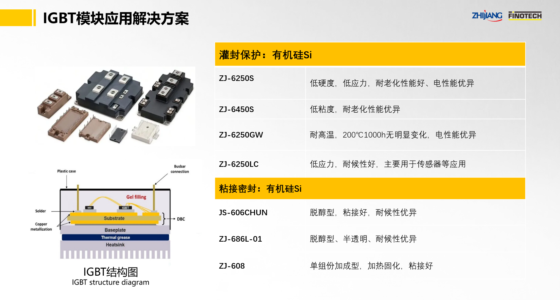 IGBT封裝材料:ZJ-6250S/6250GW、ZJ-6450、ZJ-6250H、ZJ-6250LC有機硅凝膠; IGBT粘接材料:JS-606CHUN、ZJ-686L-01、ZJ-608。