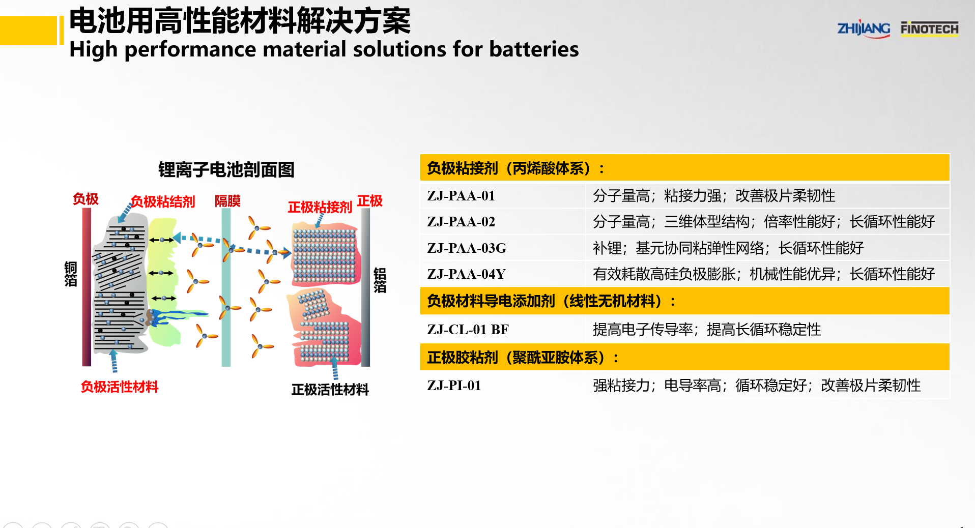 ZJ-PAA 01/02/03/04(負極膠)、ZJ-CL-01 BF(負極添加劑)、ZJ-PI-01(電池正極膠)