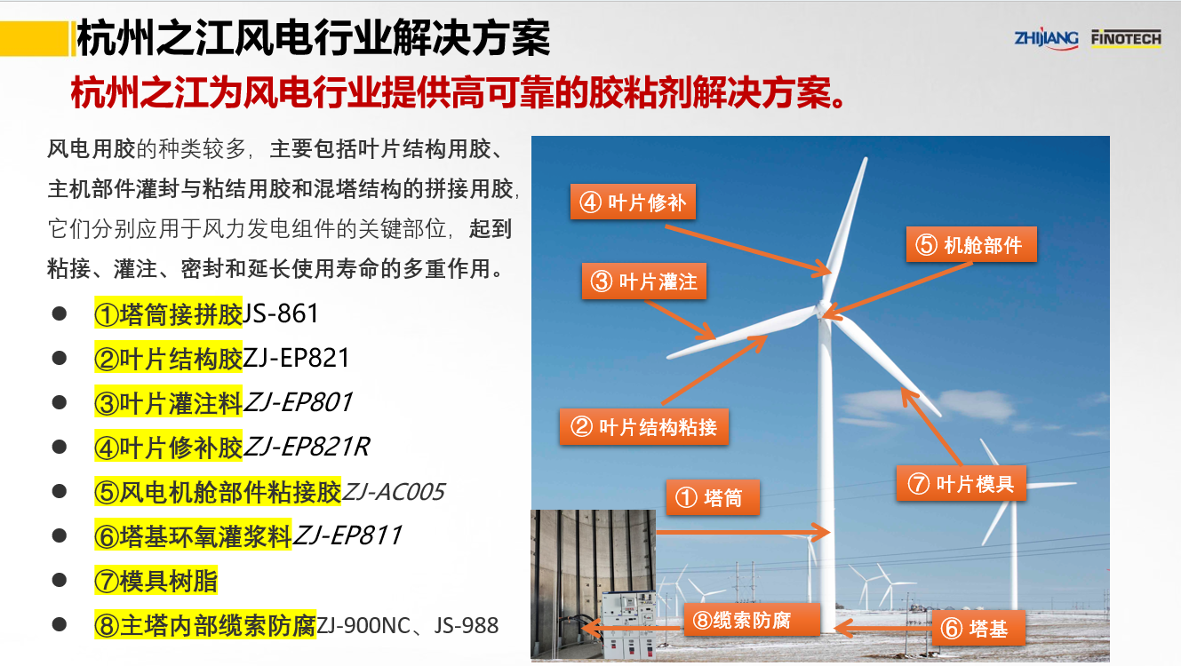 之江公司立足于中國膠粘劑行業領軍企業和有機硅、聚氨酯、環氧等專業膠粘劑的產業化優勢,具有國家級高新技術企業和國家級企業技術中心資質,依靠國家級CNAS實驗室以及國家級博士后科研工作站,并有國際專家助力,為風電行業提供高性能的粘結密封解決方案。其中,關鍵產品如下: